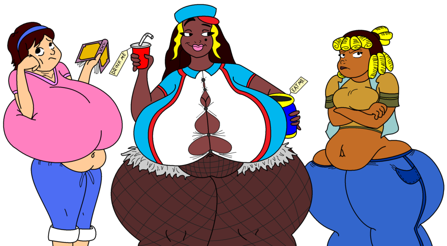 These girls are not mine, they belong to stuffu(DA) From left to right: Toy-Toy (breast expansion), Frasier (extreme hourglass - which is rather hardly visible due to those ginormous tits and humongous hips), Lee-Lee (booty expansion) Additionally, all of them have developed a little potbelly since those aren't some low calorie snacks...