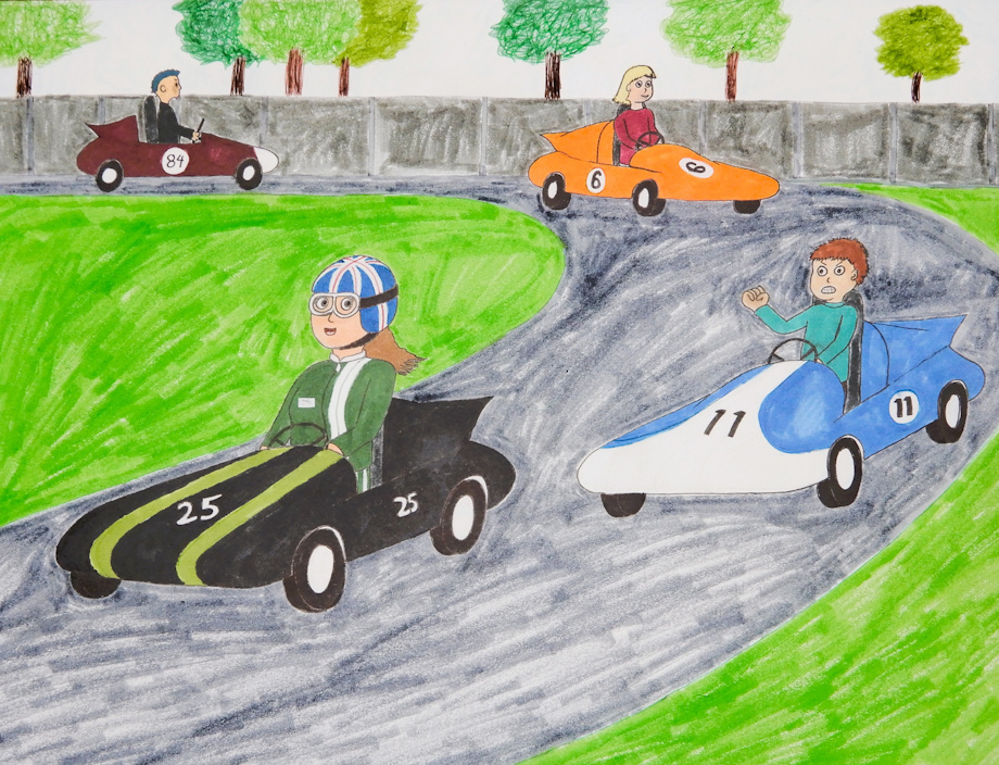 Okay, so it's a local go-kart track instead of Goodwood, but Abbey Lane (car #25) is able to prove she has the skills and bravery to compete with the best drivers...even as she shows off in front of her chauvinistic little brother David (car #11) . Maybe I should've let you witness what went on before it was their turn at the karts: DAVID (somewhat sternly) : I don't care if you are my sister and Daddy likes to race cars...It's a well-known fact that GIRLS CAN'T RACE! ABBEY (with a smirk) : Well, you just wait until we're on the track...I'll make sure you eat those words! And make him eat those words she does! Despite her starting in the middle of the grid, she makes short work of passing the other karts and taking the lead. She even even laps some of the karts, including David's, without even a scrape or bump. The impressed crowd showers her with cheers and applause as she pulls into the starting area. Even the owner of the track is so impressed, he strongly suggests she start competing in the races at Goodwood. But her father reminds the owner that Abbey will have to wait a few years before that ever happens (she's 15) ...unless of course they hold midget kart races there.