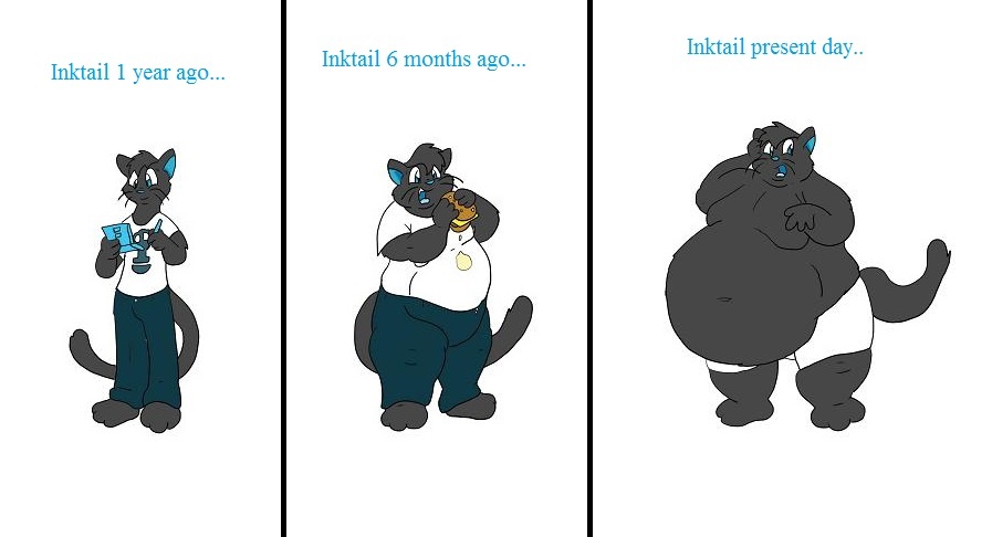 So in the past year, Inktail has really changed, in more ways than one. Just to think that almost a year ago he was a skinny, shy, cat. But as time pushed on, he started to put on the pounds, he went up a couple pant sizes, and really built up an appaetie. Now he can't even fit into the cloths he had a year ago, but is no longer scared of what others think of him, and pretty happy with his new girth. It is amazing how someone can change in one short year...