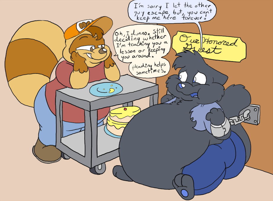 So naturally being a black cat, Inktail finds himself changing careers quite often. This week: Pizza Delivery guy. It was his first night and his first customer, a very pudgy coon named Boomer. He seemed friendly enough, and even invited Ink inside while he went to get his wallet. Of course the cat's curiosity got the better of him when he heard a whimper from the basement. Naturally he went to investigate, and was startled to find a bound bunny, who had been stuffed to the gills with food. He begged Inktail to free him, which sprung Ink to action. What he didn't see coming was for the bunny to knock him out and leave him for Boomer to come find while he was out.