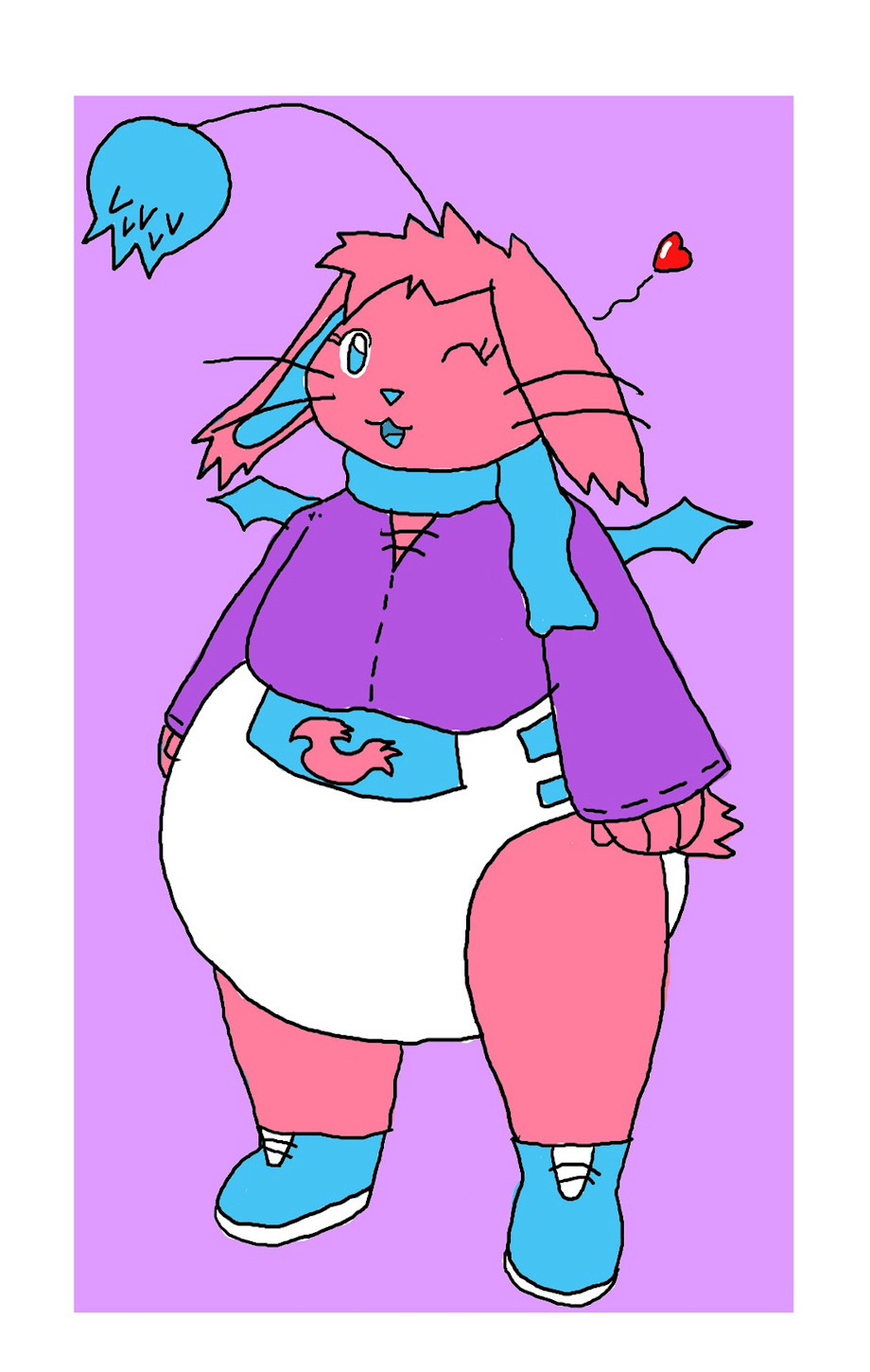 So some of you remember when I drew my mate vaughntalzer a moogle version of her kitty form. ( http://www.furaffinity.net/view/9292634/ if you haven't seen it yet ) Recently however she has switched to a Guilmon as her main form, a pink and blue one to be exact, and I felt it made her old moogle form unfitting. So naturally i went and made a new pic reflecting this. So please enjoy this adorable cotton candy diapered moogle girl ^^ Originally posted on 2013-02-18.
