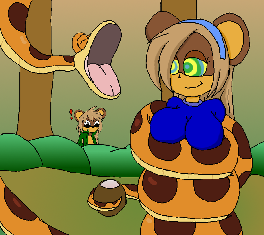 Anyway, Kaa is force feeding her the milk so she gets "bigger" and is about to eat her. The guy in the background, Johnny, is preparing to save her.