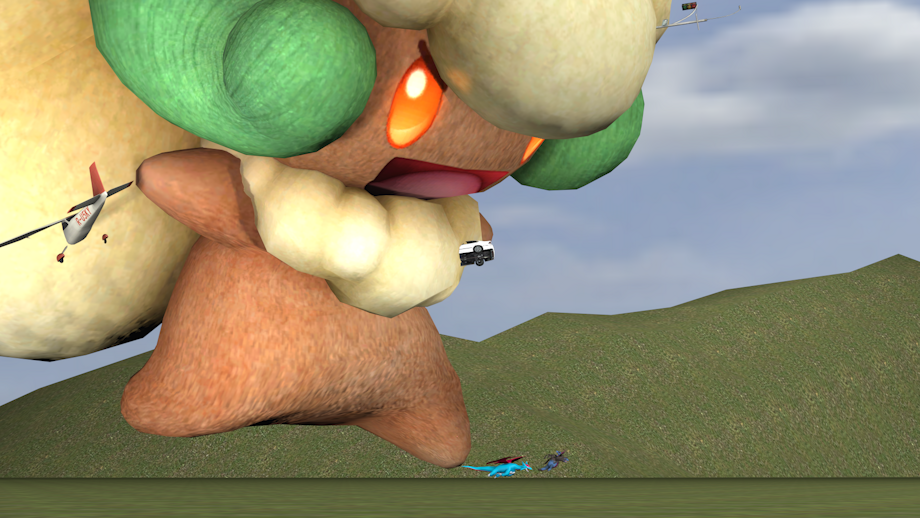 One of the random thought I had is that sun cherrim walking animation looked like it would be perfect for some very bouncy stompy stuff if you make it really big, so here a very large cherrim chasing a car using that very animation.