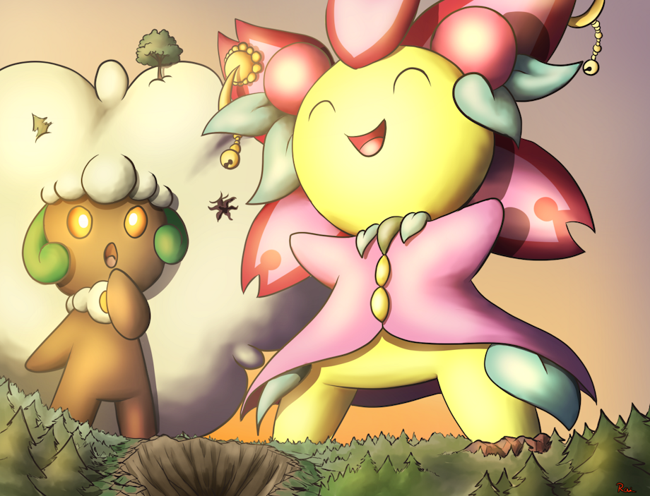 A proud Cherrim is enjoying the sunset, as most Cherrim do, but her happy stature got the curiosity of a Whimsicott ...Did I mentioned that they're both gigantic? You might have noticed considering this Whimsicott have some tree stuck in his fluff.