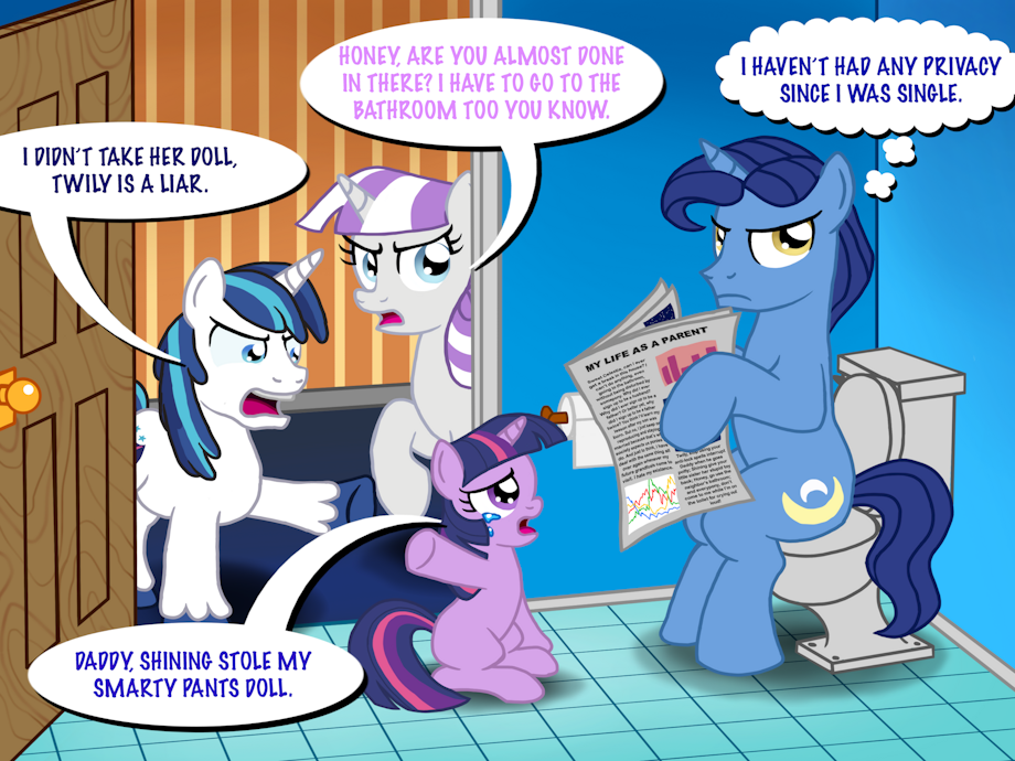 One thing that Night Light wasn't warned about is that upon becoming a parent, privacy simply doesn't occur. As he brought his newspaper into the bathroom and sat upon the toilet for a few minutes, he was quickly interrupted by his daughter Twilight Sparkle who managed to open the door using an anti-lock spell. She cries to her father, seemingly ignoring the fact that he's on the toilet and desires some privacy, that her older brother Shining Armor stole her Smarty Pants doll. Shining then follows his little sister into the bathroom denying her allegations of theft. As if things couldn't get any worse, his wife Twilight Velvet also enters the bathroom urging her husband to hurry up and finish as she needs to go as well. Annoyed by the situation, Night Light starts to contemplate every single life decision he made that lead up to this very moment in time. Consider this a sequel to my drawing, "Our Two Precious Angels" that I made on my DeviantArt page.