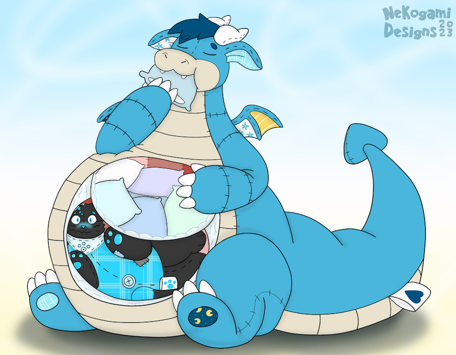 Normal dragons can be greedy and possessive as it is, but a plush dragons will not only hoard things, but friends as well. Inktail found this when Scarf casually stuffed him into his belly, followed by a couple dozen pillows. Thankfully Ink is no danger of being made into stuffing... but at this rate he will be squished down so deep it will be awhile to find his way out.