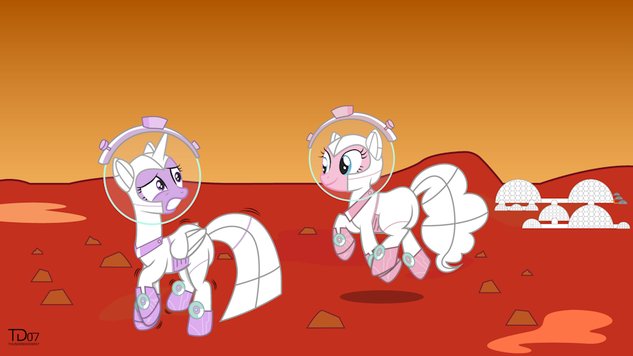 This was one of the generated mashup for the Mash Up Challenge I received a few months ago and I finally decided to do it. This was the first idea that popped in my head when I got it. I don't know why. Spacesuits are based on the one Rainbow Dash wears as a costume in Scare Master. My randomly generated mashup was: One of the Mane Six, on a Mars colony, having the most embarrassing moment.