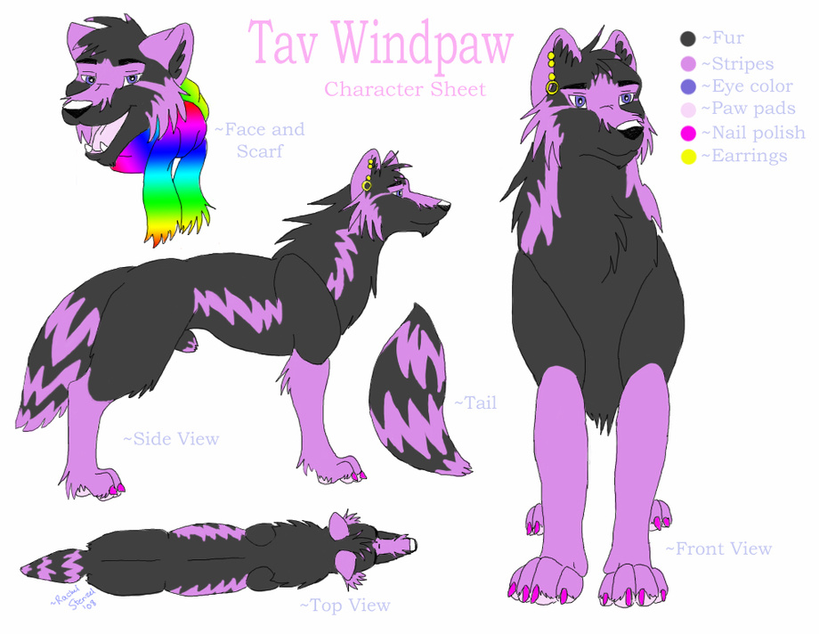 FeMale Feral Wolf All Black except for the Purple thats around her body. Purple Stripe comes from around her eyes to the base of her tail. Her Tail is like a raccoons black on Purple 3 times. Her ears are all Purple except for the inside which are black. On her Right ear she wears 2 stud earrings towards the tip of her ear on the lower part of her ear she has 1 stud earring and a hoop earring. Around her eyes is like a mask and down the bridge of her nose is Purple. Her Paws are Purple. Her claws are Very sharp and are usually are Painted to be a Nice almost Neon color shade of pink. Sometimes they are not done and our there Regular color.