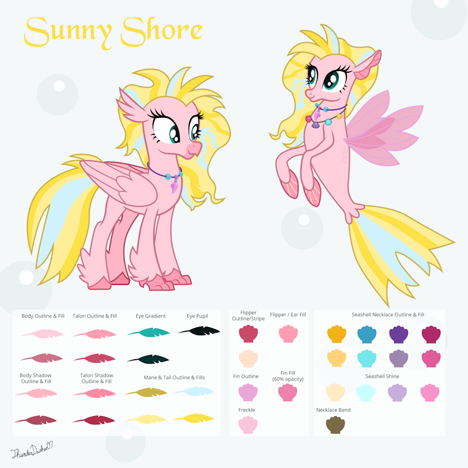 Sunny was born in Seaquestria as a seapony some time after the hippogriffs went into hiding. When the hippogriffs returned to Mt. Aris after the Storm King's defeat, Sunny decided to switch between her two homes. After hearing stories from Silverstream about Princess Twilight Sparkle's School of Friendship, Sunny decided she wanted to join. She is waiting to see if she is accepted into the school.