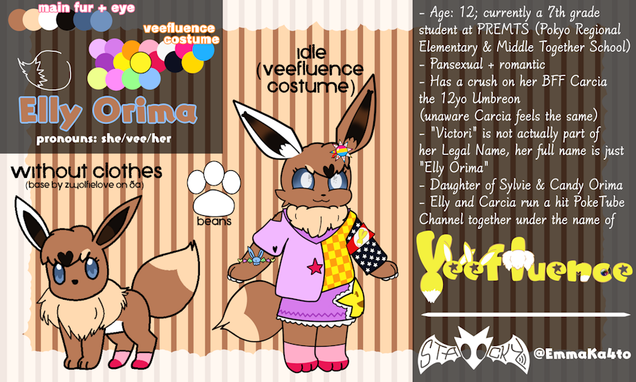 A recent redesign of Nikki's(https://www.furaffinity.net/view/38430652/) canon-universe Eevee Daughter Elly Orima, I had the idea to make her a young influencer she is a host of a PokeTube Channel called Veefluence