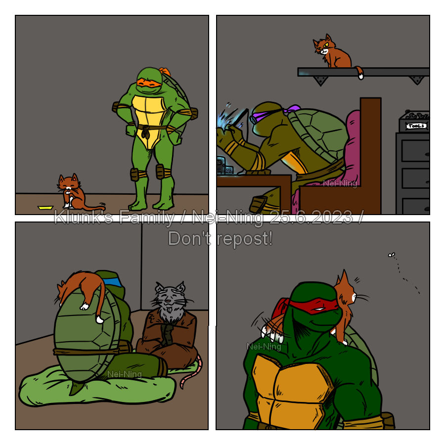 Klunk is always happy when Mikey feeds him. Klunk likes to observe Donatello's doing. Klunk likes to sleep on Leo's shell / shoulders / back on the neck when he's meditating (or trying to) with Master Splinter. Klunk keeps Raphael as his climbing tree when chasing flies :3