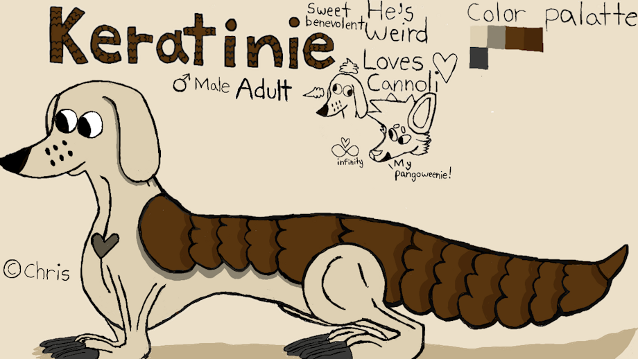 Keratinie's design is based on a large standard dachshund, what makes him a hybrid is keratin scales, pangolin tail ,pangolin claws and long pangolin tongue. Downsides of this character, that he can roll like a pangolin, because of his long body is prone to back issues, but can dig with his pangolin claws and use his long tongue.