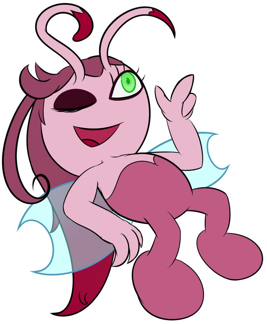 The right antennae (her left) has a pointed end and hangs lower than the left antennae (her right), which has a round end and is shaped like a backwards question mark by default