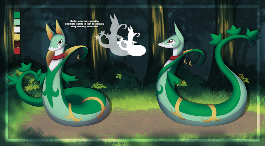 So, here we have Slethy, a big, friendly, snuggle-loving Serperior with a love for cooking, happily providing cuddles, delicious meals or more, enjoying helping others relax and have a good time overall. As for their tendency to wear collars, it's somewhat of a standard thing for them, no real deeper meaning to wearing one save for that he doesn't feel quite comfortable without one.