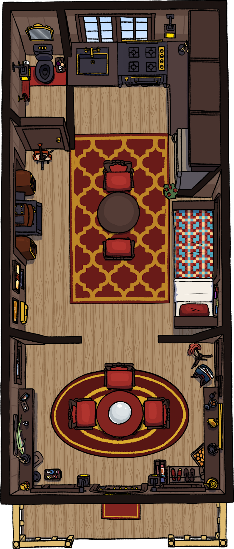 I made a little interior map of Tamarisk's caravan! Bottom most room is where she takes clients and does her psychic readings. Top room is her living space. There's supposed to be a second pull-out bed underneath this bed for guests. Technically this can hold up to four people but, uh... You know what, they can sleep on the floor it's fine XD