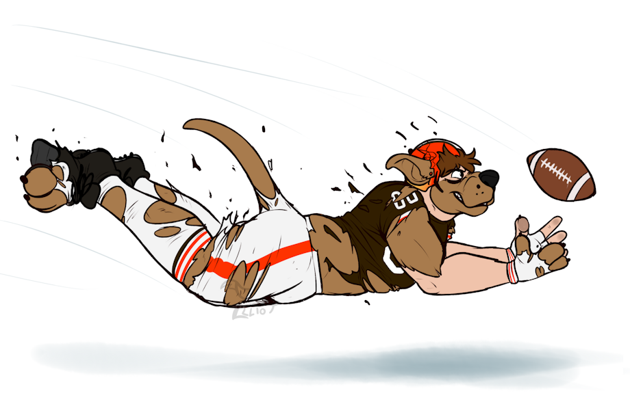 Wanting to visit the Rock & Roll Hall Of Fame, I travelled to Cleveland, and made a pit-stop at FirstEnergy on my way out. Trying on the Browns' uniform, I decided to test it out and dove for a catch as I transformed into Chomps, the Chocolate Labrador!