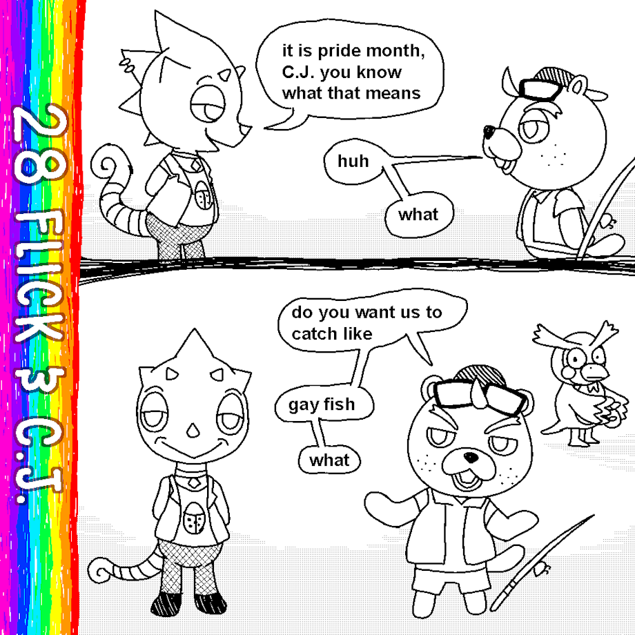 Only so many days left! I had a silly one planned but I'm running out of dates and realized I could do this meme comic since I like it a lot and saw it just in time for this month. :3 Flick and C.J. won't make my post for tomorrow so squeezing them (and Blathers) in here seemed like a good fit~! B3 Happy Pride Month!
