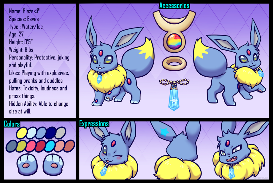 This here is my main persona, BlazeVee and as you can see I am a blue Eevee covered in red gems with a blue star on the back of my left ear.