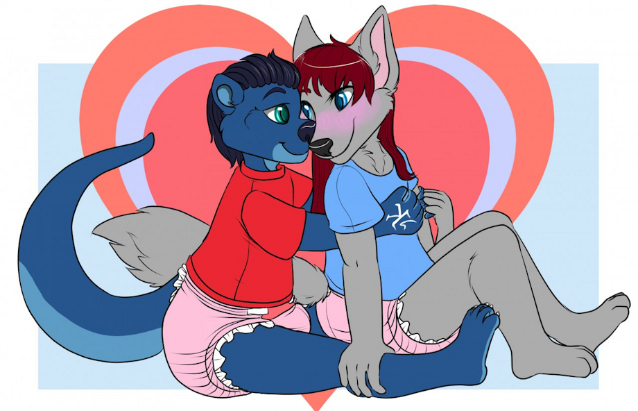 Jay nodded his head, as he removed the otters underwear and placed the pink diaper beneath Joey to replace it, as he began to pull the otters tail through the back. The wolf then proceeded to fold the diaper up around the otter and fastened it on snuggly pulling the tapes on up to the front before laying down on top of the otter. The two just snuggled up lovingly, in nothing but their shirts and diapers now, as they nose nuzzled each other softly and warmly.