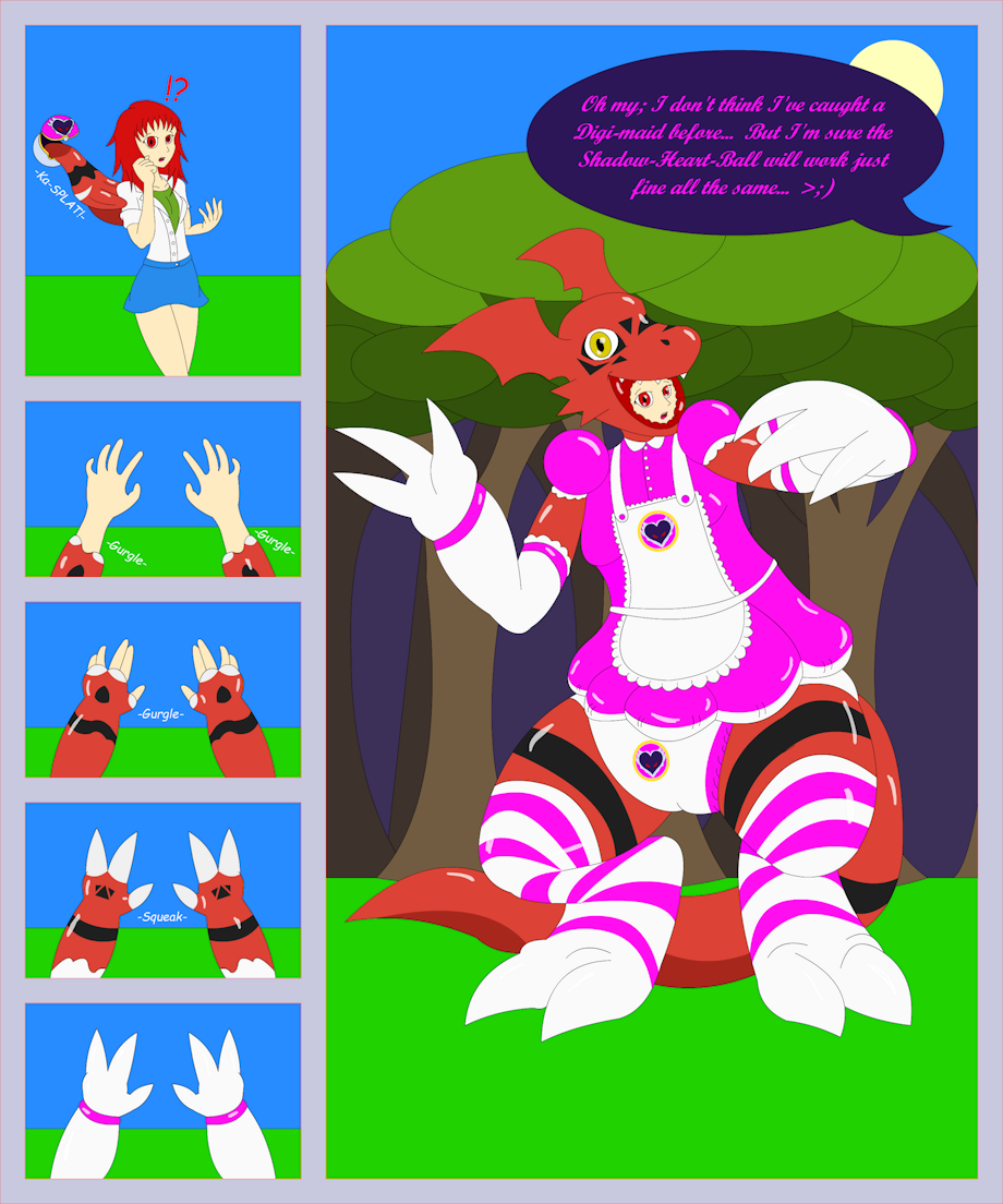 Sort of a sequel to the last Dani pics and a trade with Silvafang988. Seems like Lily before her Amelia crossed Dani's path while he was out testing his new rapid-conversion toys. Oh well: I'm sure that Guilmon suit is going to feel like home in no time!