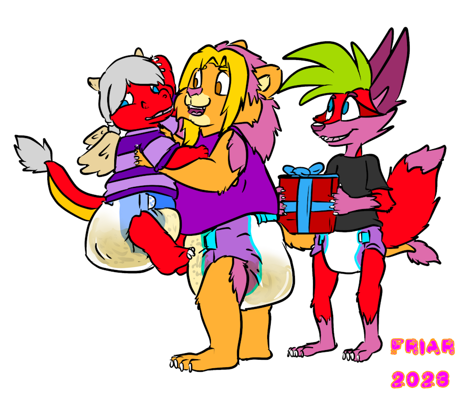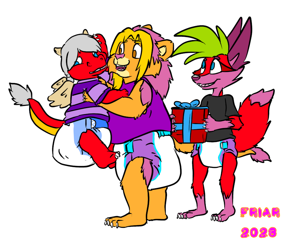 Illustration of Tacki the regressed dragon hatchling being given uppies by Friar at his birthday party. Berry the fox stands behind smiling at Tacki holding a wrapped up present, and Everett is cheering behind a box with a birthday cake. Friar and Tacki are both messy, and Tacki looks a bit embarrassed. A tabletop role playing game board is on the floor of the treehouse, as well as a fountain of youth baby bottle.