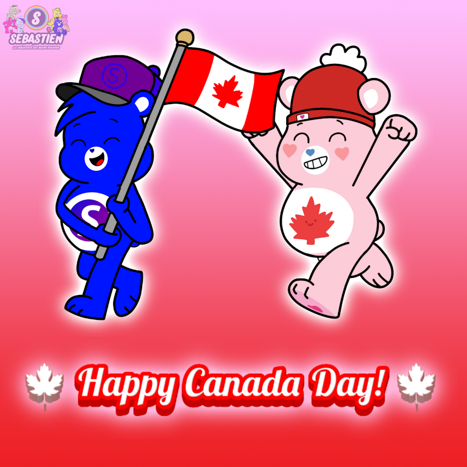 This is a drawing focusing on Creative and True North Bear walking fast with a waving Canadian flag celebrating Canada Day with pride!