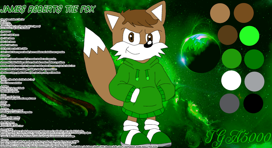 Backstory: James Roberts the Fox was created by Dr. Eggman as part of an experiment to create a new ally. However, James quickly realized that Dr. Eggman’s plans were harmful and oppressive. Choosing to follow his own path, he betrayed Dr. Eggman and joined forces with Sonic and his friends. James brings a unique combination of technical knowledge and a rebellious spirit to the Sonic Crew, proving himself as a valuable ally in their ongoing battle against evil.