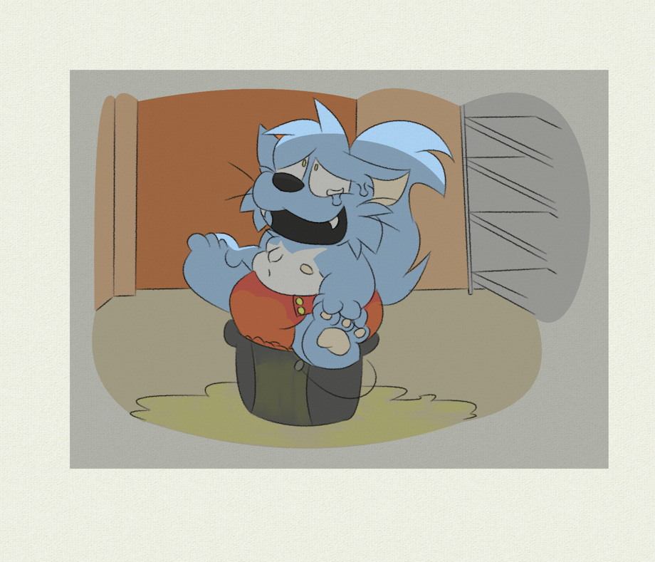 Yure needed to pee really badly. The bathroom was broken and he felt that his diaper would not hold all the urine he had saved up. So, he entered the janitor's closet to see if he could pee in a bucket. But even the bucket seemed like it would not hold it. He decided to sit on the bucket and wet his diaper, in hopes that the diaper would absorb it and the bucket would catch what leaked. Turns out neither the diaper nor the bucket could handle Yure's massive bladder.