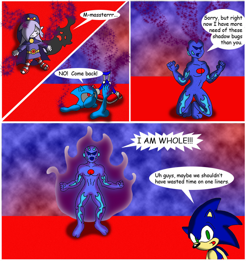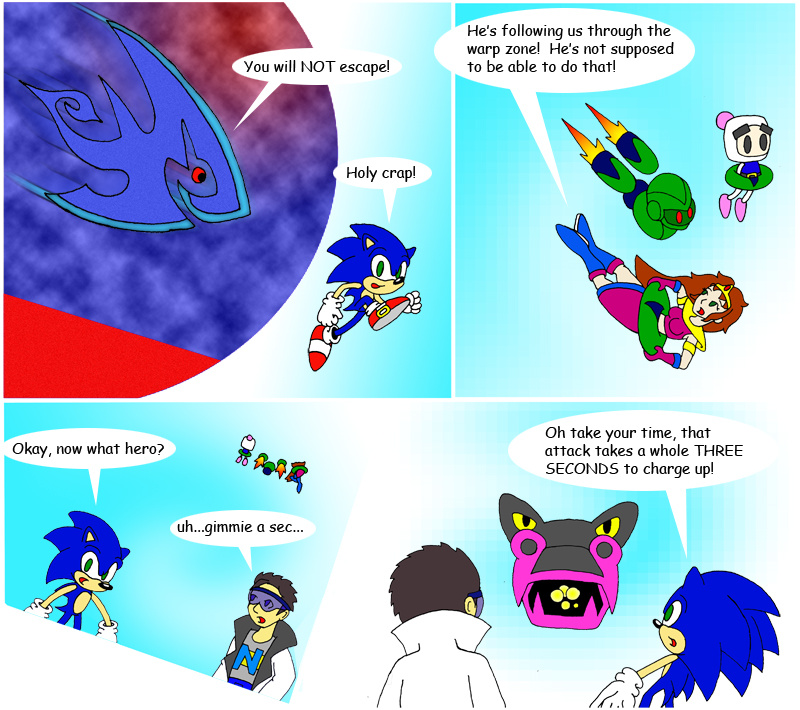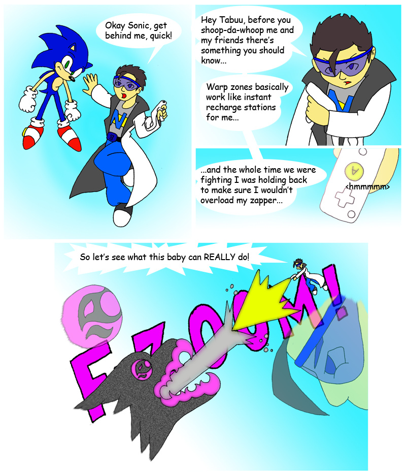 This was the last chapter of my webcomic, I planned to continue it but real life got in the way, job, my then new hobby of making custom toys, and the fact that I couldn't really figure out how to illustrate the next scene. Eventually I simply abandoned the project. My plans were to have an exposition page about the nature of the gaming multiverse, then the next arc would be the chaos emeralds the Vaati cast out of Sonic back at the beginning finding their way into other game worlds and wrecking havok, so the next few storylines would be a collector quest. I planned on visiting obscure classic games like Ristar along with some of my favorites like Metroid and Legend of Zelda. Tabuu was supposed to be somewhat nerfed too, he still had some of his powers but outside of his subspace realm he wasn't nearly as strong (since he only absorbed a small fraction of what he intended to from the princess) and he wouldn't be able to adapt to the various game universes the same way Captain N would, so in some places he'd be overpowered but in others he'd be weak and vulnerable. I also wanted to do a "Vectorman Gaiden" story which would basically be a comic version of the 2 Vectorman games, ending with Earth finally being cleaned up after defeating the giant bugs and him being inducted into the Queen's royal guard since his version of the world was at peace.