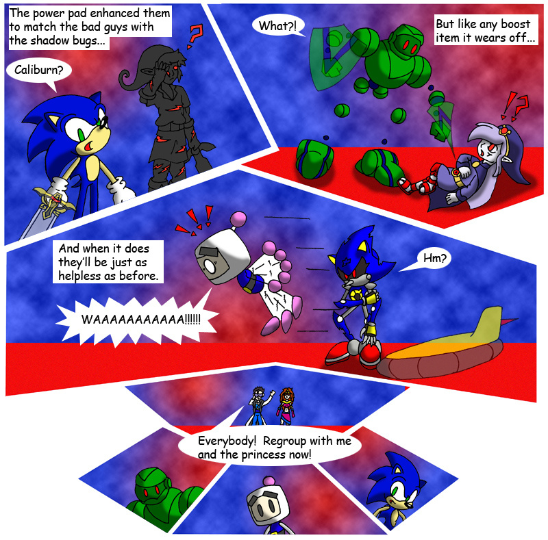 This was the last chapter of my webcomic, I planned to continue it but real life got in the way, job, my then new hobby of making custom toys, and the fact that I couldn't really figure out how to illustrate the next scene. Eventually I simply abandoned the project. My plans were to have an exposition page about the nature of the gaming multiverse, then the next arc would be the chaos emeralds the Vaati cast out of Sonic back at the beginning finding their way into other game worlds and wrecking havok, so the next few storylines would be a collector quest. I planned on visiting obscure classic games like Ristar along with some of my favorites like Metroid and Legend of Zelda. Tabuu was supposed to be somewhat nerfed too, he still had some of his powers but outside of his subspace realm he wasn't nearly as strong (since he only absorbed a small fraction of what he intended to from the princess) and he wouldn't be able to adapt to the various game universes the same way Captain N would, so in some places he'd be overpowered but in others he'd be weak and vulnerable. I also wanted to do a "Vectorman Gaiden" story which would basically be a comic version of the 2 Vectorman games, ending with Earth finally being cleaned up after defeating the giant bugs and him being inducted into the Queen's royal guard since his version of the world was at peace.