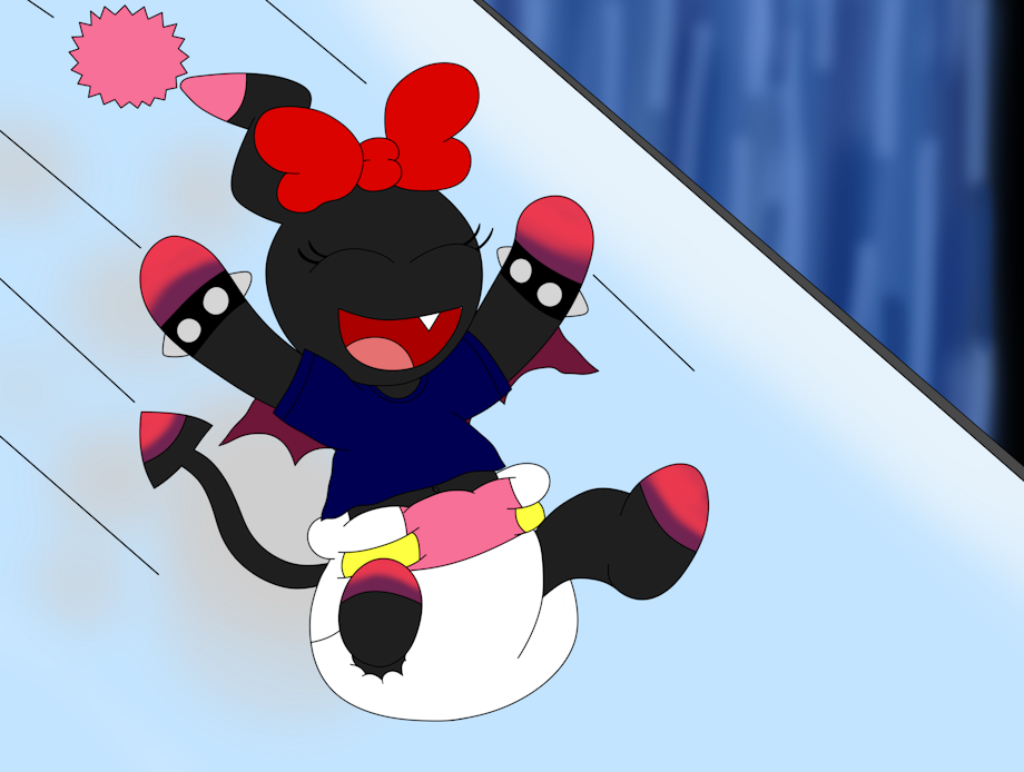 An idea I had in mind for a while that I was finally able to draw, especially after listening to the Slider theme from Super Mario 64 so many times. Here's Cherry the Baby Dark Chao sliding down the slide inside that cottage in the fourth level from Super Mario 64, Cool, Cool Mountain. I wish you could get slides like them in real life...
