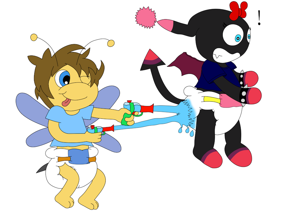Gift art for RogeyKun, just to say thanks for the pictures he had featured my Dark Chao character Cherryade in some pictures he commissioned. A sort of sequel to https://www.furaffinity.net/view/39703507/ with Dee the baby bee getting revenge on Cherry for turning him into a Mog from Final Fantasy, by squirting her behind with water pistols. Simples! XD Hope you like! ^^