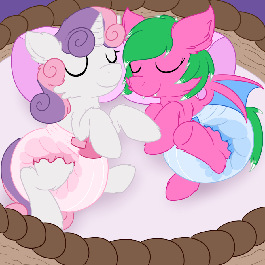 Commission for anonymilk FA of their batpony foal Lolly Crunch sleeping next to Sweetie Belle.