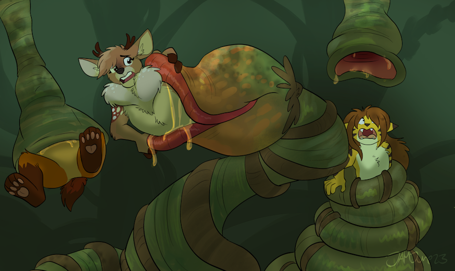 Art for xionzappa on twitter featuring Katojana and me versus a particularly peckish plant.