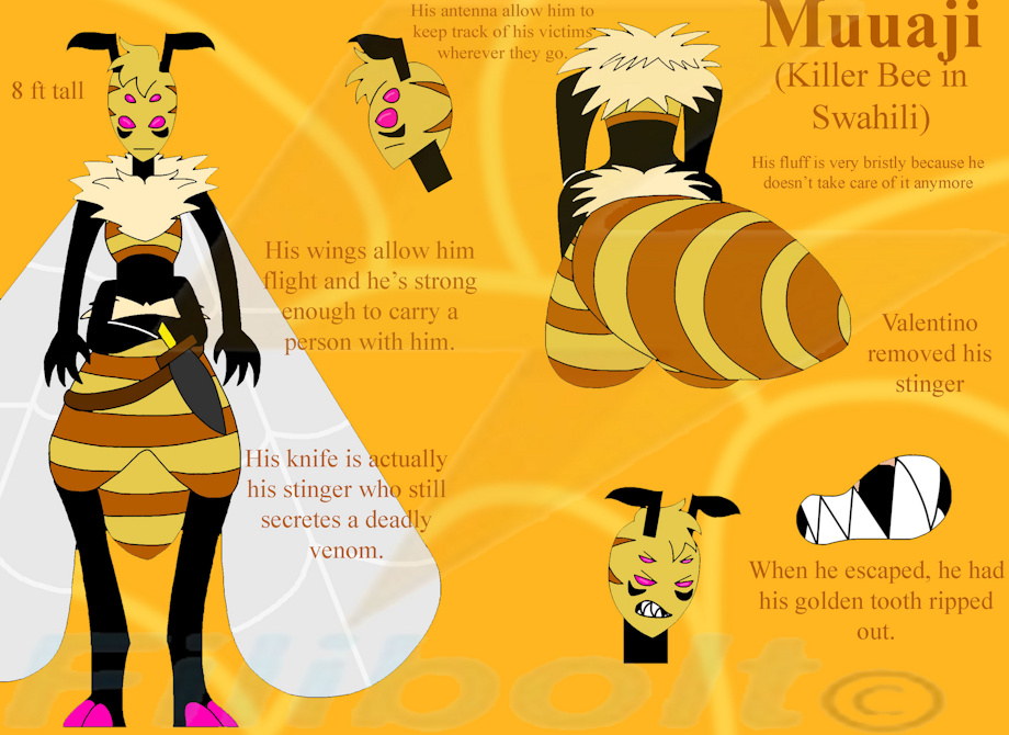 Meet Muuaji, also known as "The One who Got Away". He was an African assassin who died in 1937 and he was Valentino's top porn-star before he managed to escape, being the first one who ever managed to break free from Valentino's abusive behavior. Ever since he became a hit-man, with a huge resentment towards Overlords and especially Valentino.