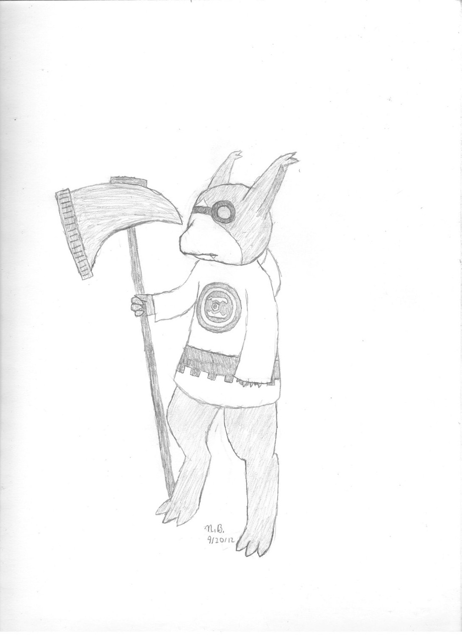 A gremlin thwacker from the game Spiral Knights. They use hammers for weapons, though they don't look like this one. I was lazy and didn't want to try and draw the fancy looking ones they use in the game.