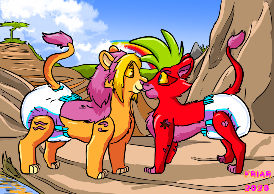 Illustration of Friar the diapered feral lion and Berry the diapered feral lion kissing in a rocky canyon adjacent to the savannah. A rainbow is in the background. The characters are drawn in The Lion Guard style.
