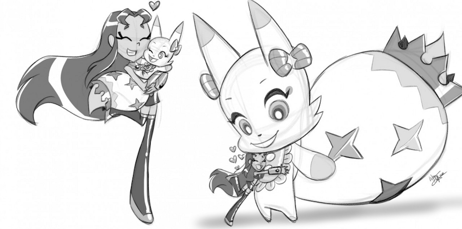 Here we have the-two scenes of the-two adorable characters: Starfire from the-Teen Titans GO! (yes, that Teen Titans GO), and Tama from World of the-Final Fantasy.