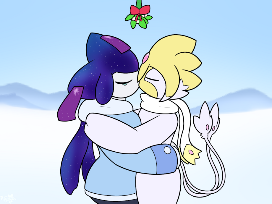 Jodie (the Jirachi) has fallen in love with Povynn and now the two are kissing under the mistletoe! (I know it's July, shush)