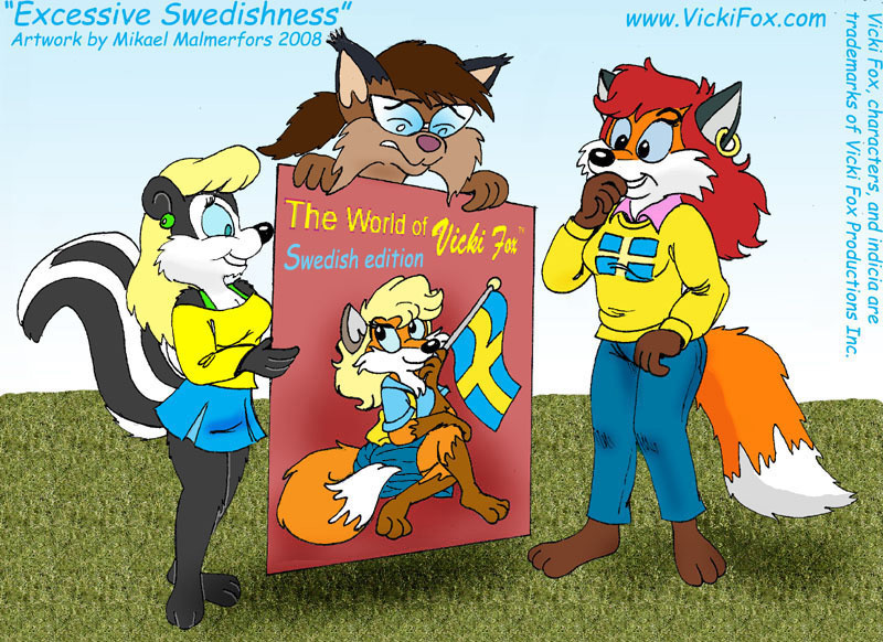 I don’t usually draw fan art, but this was made in celebration and commemoration of an important historic event, namely the Swedish translation (provided by yours truly) of the comic “The World of Vicki Fox” by Michael Russell and Laura Howell. (You have to log in to Vicki’s Yahoo group if you wish to read the comic strips in Swedish, but the translated comic will eventually move to Vicki’s regular site.)