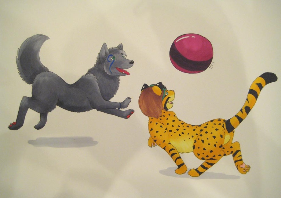 A full colour commission done for a Cheetah girl named Tia and her wolfy friend. I don't have much experience with ferals, so this was a good exercise for me. I was really worried I wouldn't be able to do it, but it turned out alright, and I had some help from my cheetah-expert friend Akagen, so it worked out. That ball is awful though, ugh.