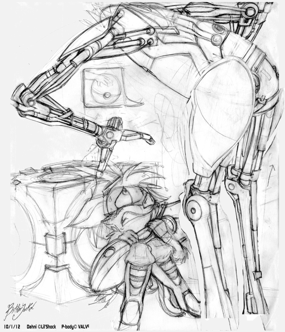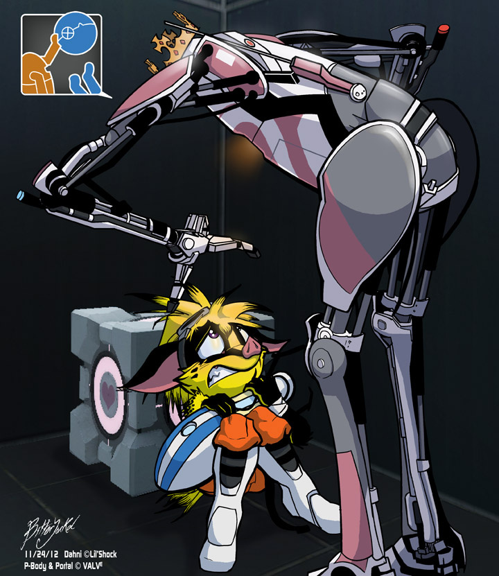 As excited as Dahni was to be testing with P-Body, he may have over-estimated his athletic prowess... and P-Body's patience. It's uncertain as to whether or not P-Body is aware Dahni's head is not a modular component...or perhaps she does? Run Dahni!