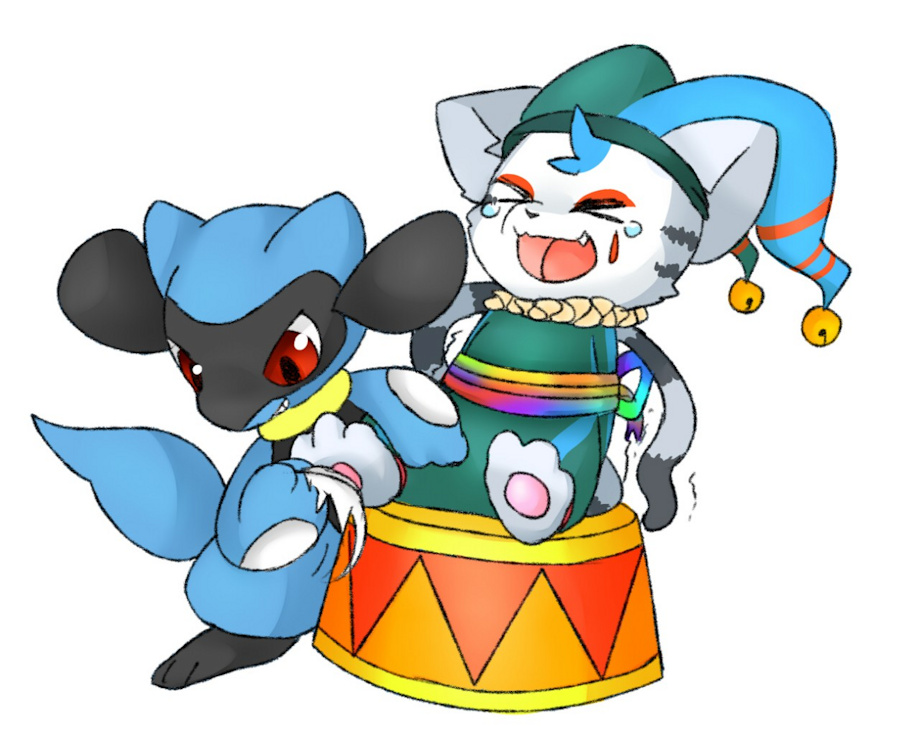 This is another commissioned piece I got from rachelwars over on FurAffinity. I. LOVE. RIOLUS. THey're so adorable I want one!!!!!! >w< Anyways, here we have a cute lil' troublemaker Riolu who somehow managed to tie up Sly using the long ribbon he 'magically' pulled out of his sleeve and now he's teasing the poor kitty with a feather to his sensitive paws! Oh the humanity!