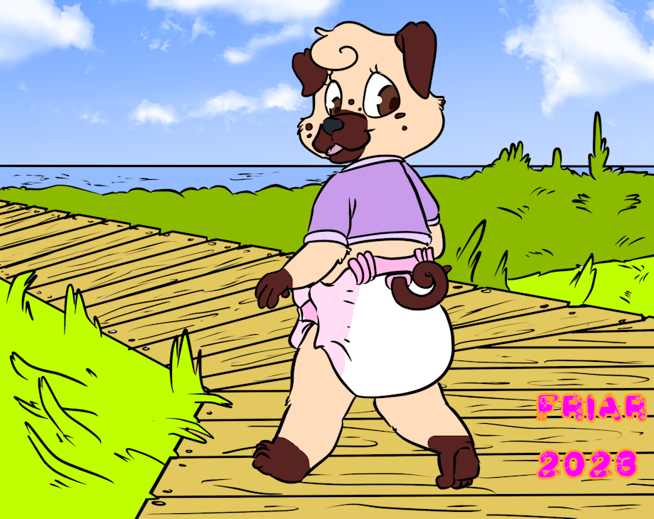 Illustrated commission of diapered Bella Pug walking on the boardwalk.