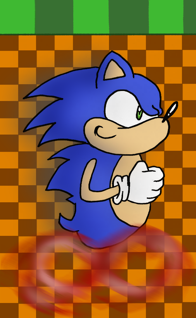 A drawing of Sonic that I drew inked on paper and colored in Clip Studio Paint. I made the backgrounds similar to the tiles in Green Hill Zone.