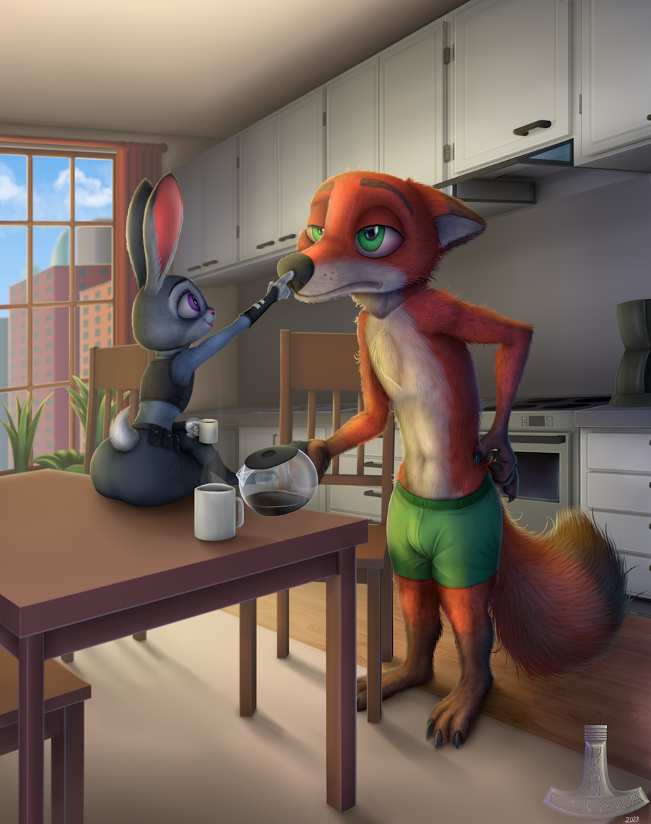 Nick and Judy preparing for their work day. Somebody is obviously less ready than the other.