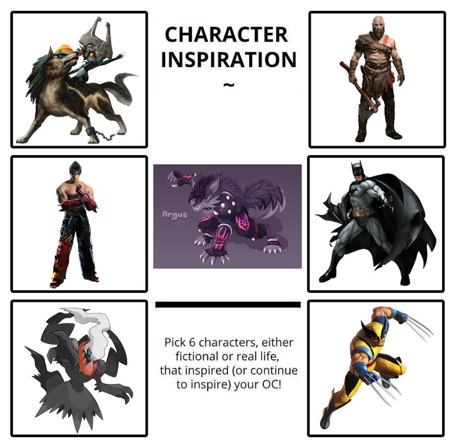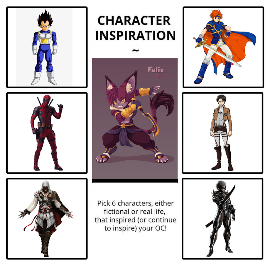 A compilation of my ocs used in character inspiration meme templates, along with images of fictional characters that inspired their designs and personalities.