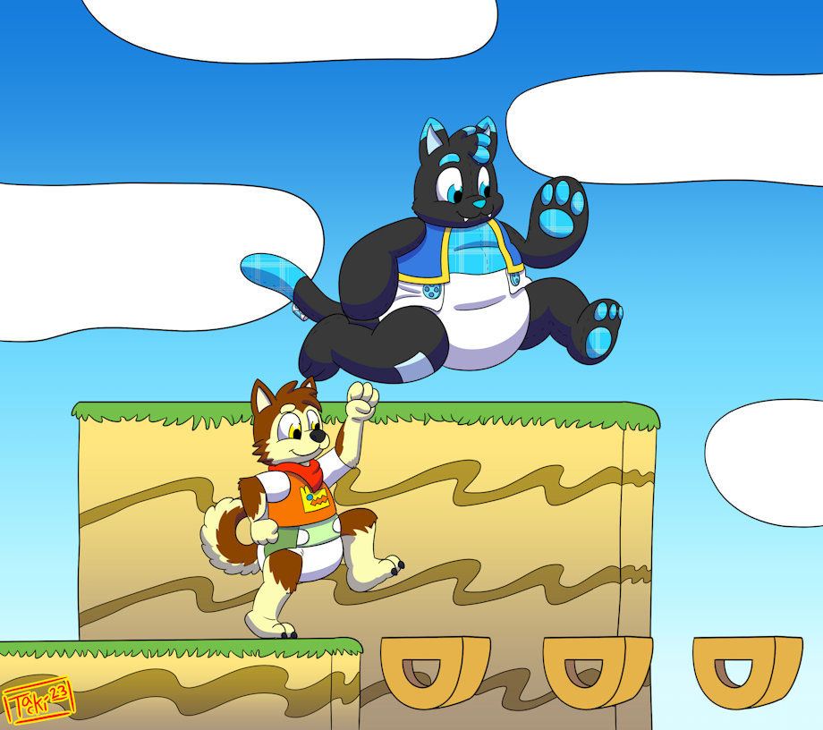 and Rustypaw's birthday yesterday. I whipped them up a quick pic to celebrate the occasion. Here they are playing some sort of Mario Bros-esque platformer game. I'd buy it!