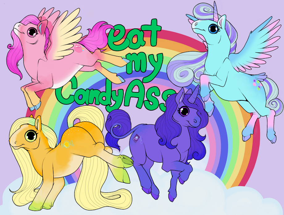 Some colorful candy horses that request that you eat their ass. We have Lemon Candy, Popping Candy, Bubble Gum and Gum Drop