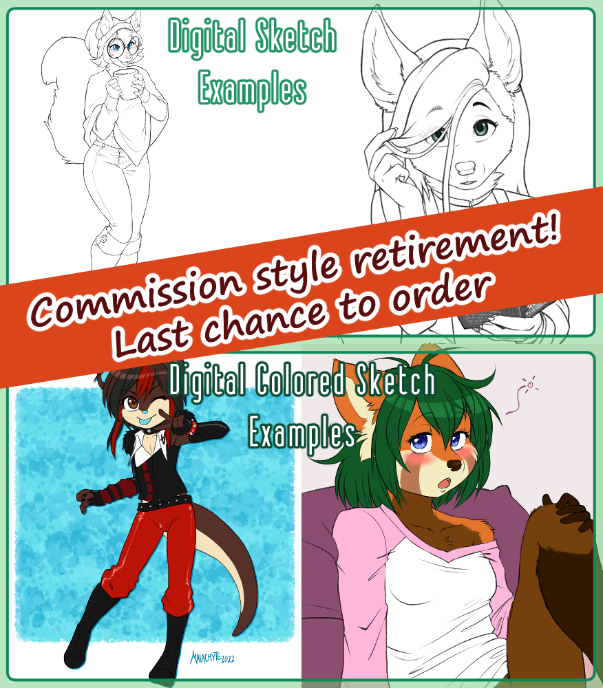 Attention! I am retiring the current commission style at the end of July, and offering something new starting in August. If you're interested in getting a commission in the pencil-textured, flat color style, this is your last chance to do so for a while. Head over to my journal post for details and links to the google form. Thanks!